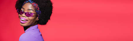 happy african american young woman in purple stylish outfit and sunglasses isolated on red, banner