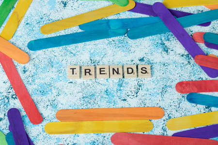 Trends, word in wooden alphabet letters isolated on colourful background