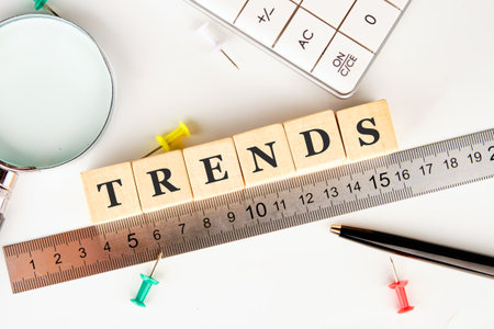 Colorful letter blocks spell out trends on a ruler, surrounded by a magnifying glass, pushpins, and a calculator, showcasing a dynamic workspace for analysis and discovery.