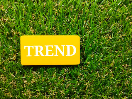 Yellow wooden board with TREND word on artificial green grass background.