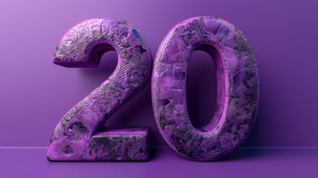 Digitally rendered image featuring the number twenty, composed of glittering purple particles. The number rests on a reflective surface, with a backdrop of a purple background, and sparkling light effects, creating a glamorous and celebratory atmosphere.