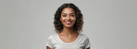 Brunette hispanic man in t-shirt smiling and looking at camera isolated over grey background