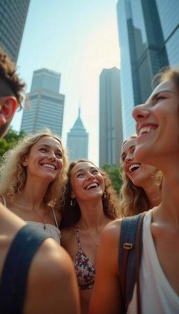 Captivated by the moment, a group of friends revels in laughter as they gaze upwards at shimmering skyscrapers. Sunlight illuminates their beaming faces, showcasing the joy of travel.