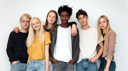 Group of diverse multiethnic young people standing in a row and smiling. Generative AI