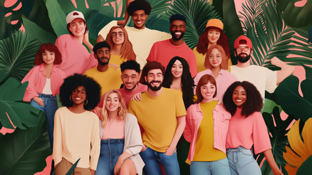Diverse group of young adults posing together against a vibrant tropical backdrop in a bright and cheerful setting