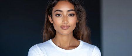 A woman with long wavy hair stands confidently with her arms crossed wearing a simple white shirt. The background features a contemporary indoor space with soft lighting.