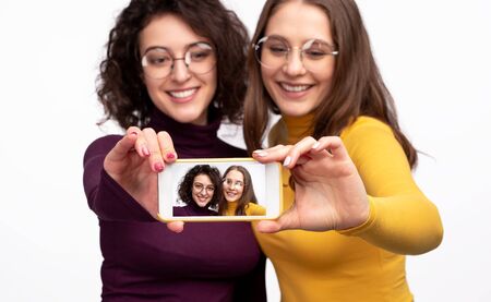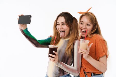 Full length portrait of two caucasian girls wearing casual clothes taking selfie photo and holding plastic cups isolated over white background