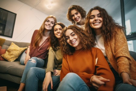 Generative AI : Diverse group of female friends enjoying party and laughing together Women friends having fun at home sitting on the couch Happy lifestyle and friendship concept