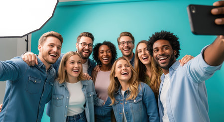 Young interracial friends, including a nonbinary person, standing together in stylish attire in a studio setting.