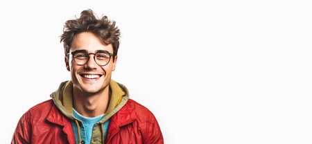 Panoramic banner, portrait of young confident hipster guy wearing denim jacket, round glasses and cap, isolated on background of lush lava color with copy space.