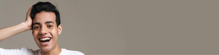 Creative image of happy multiracial people men smiling on grey studio backgrounds, panorama. Portraits of candid handsome and cheerful international group of guys posing at studio