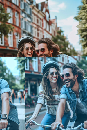 A man and a woman are riding bicycles down a street, smiling and laughing. Concept of joy and happiness, as the couple enjoys their time together on the bike ride