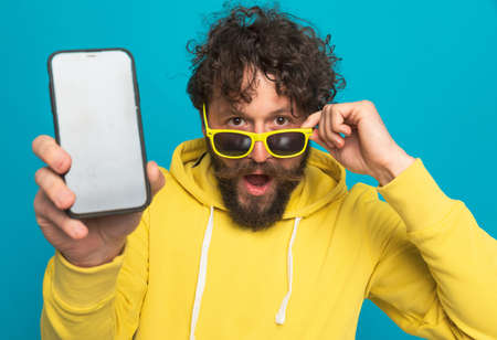 shocked casual bearded man looking over glasses and showing black empty screen while opening mouth in a surprised manner on blue background