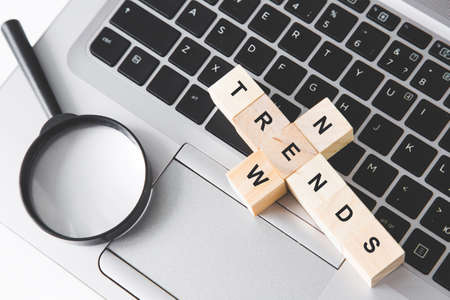 NEW TRENDS Concept 2019. search magnifier on a laptop keyboard.
