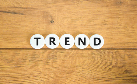 Trend and trending symbol. Concept word Trend on beautiful white circles. Beautiful wooden table wooden background. Business lifestyle trend and trending concept. Copy space.