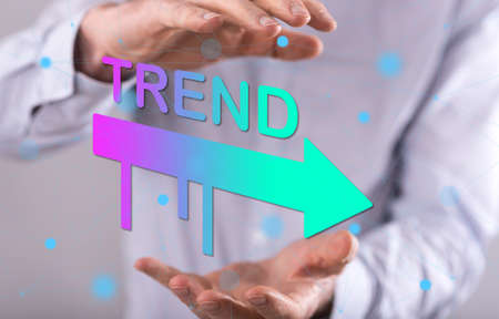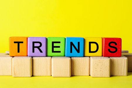 Word trends with colored blocks on yellow background. Modern trend concept banner for monitoring new business opportunities.