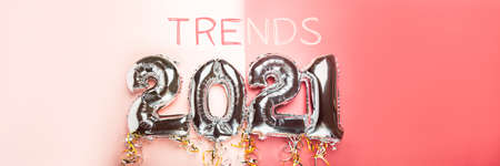 Word Trends and Balloon Bunting for celebration of New Year 2021 made from Silver Number Balloons. Holiday Party Decoration or postcard concept, banner size