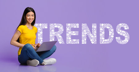Millennial Asian lady working or studying remotely on laptop, collage with word TRENDS on violet studio background, banner design. Modern technologies and online life concept