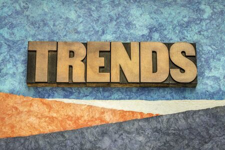 trends word typography in letterpress wood type against abstract landscape created with colorful handmade paper, business analytics concept