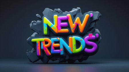 Bold 3D text NEW TRENDS in vibrant gradient colors, set against a dark textured background. The design features a modern and dynamic style for creative concepts.