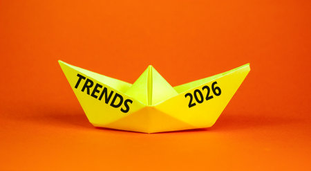 Trends new year symbol. Concept words Trends on beautiful yellow paper boat. Beautiful orange paper background. Business and Trends new year concept. Copy space.