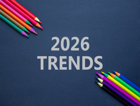 2026 Trends new year symbol. Concept words 2026 Trends on beautiful black paper. Beautiful black paper background. Beautiful colored pencils. Business and 2026 Trends new year concept. Copy space.