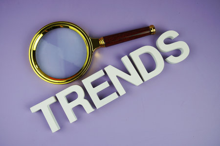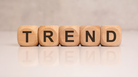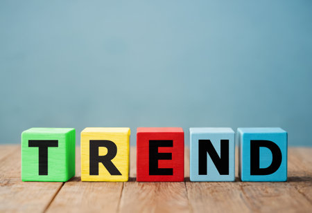 Trend concept. multicolored wooden blocks forming word trend on blue backdrop, latest trends in fashion, technology, market dynamics, business, and social changes