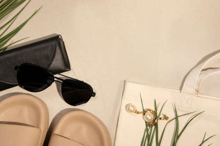 Flat lay composition with stylish sunglasses and black leather case on sand. Space for text