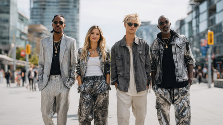 Friends dressed in eye-catching outfits walk confidently along a bustling city street, surrounded by modern buildings and bright sunlight. Their stylish apparel reflects current fashion trends.