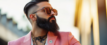 A man with a well groomed beard and sunglasses stands confidently outdoors wearing a vibrant pink jacket. The warm light creates a stylish ambiance.
