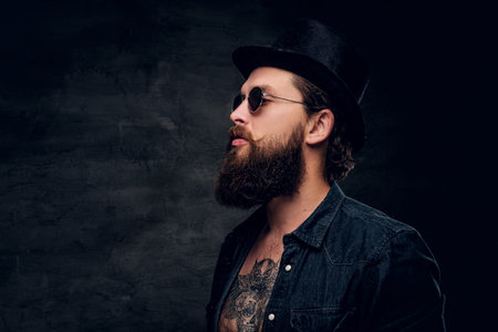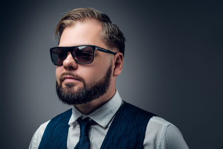 Closeup portrait of a cool bearded male in sunglasses on a dark background