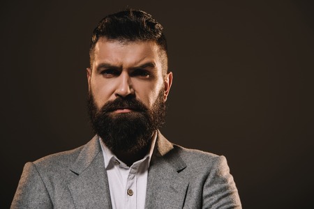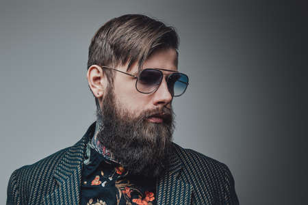 Portrait of stylish bearded man isolated on gray.