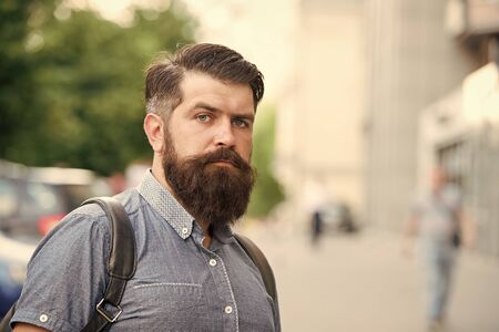 Guy exploring city. Comfortable tourism. Summer vacation. Hipster wearing backpack urban street background. Bearded man travel with backpack. Sightseeing concept. Backpack for urban travelling