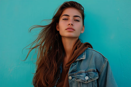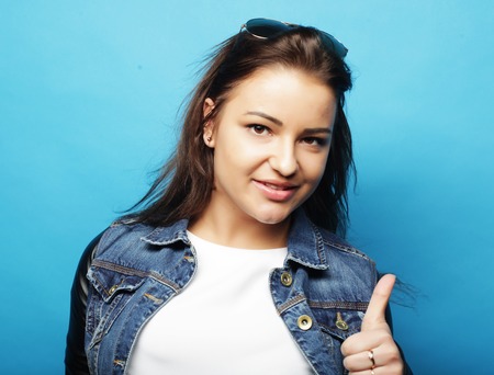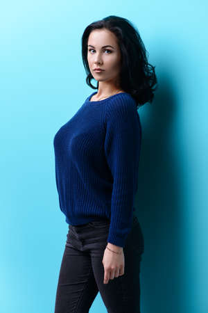 beautiful girl wearing casual clothes, posing on blue background