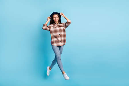 Full size photo of young attractive lovely pretty smiling cheerful girl jumping wear hat isolated on blue color background