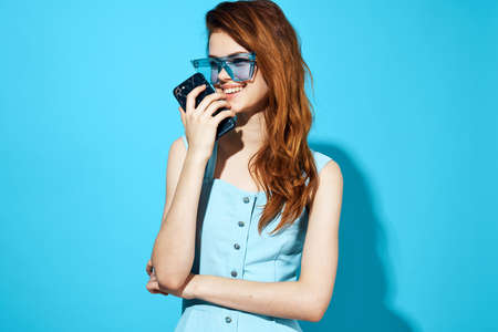 woman in a blue dress with phone in hand posing Studio fun