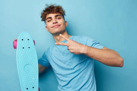 kinky guy skateboard in hand in blue t-shirts isolated background