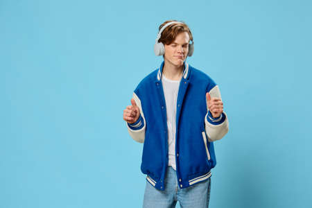 naughty handsome guy student stands dancing with hand movements on a light blue background listening to music through headphones