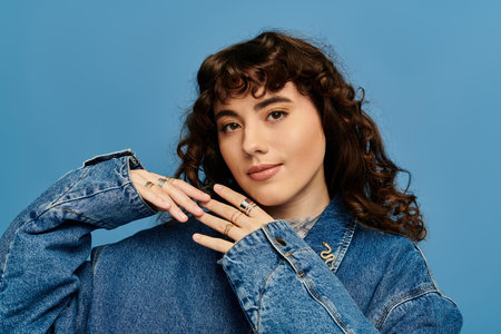 Young woman in denim jacket looking at camera isolated on beige, banner