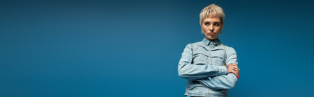 serious woman in blue jacket holding hands near face and looking at camera on grey background, banner