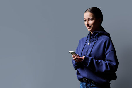 Portrait of smiling teenage girl holding smartphone on gray studio background