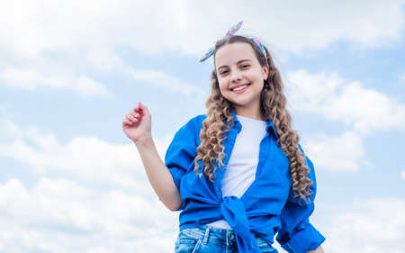 happy kid wearing casual checkered shirt on sky background, vintage style