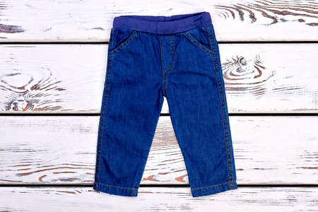 Infant kids denim trousers on sale. Baby boy or girl jeans on old wooden background. Infants brand garment.