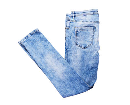 Denim pants isolated, blue folded jeans isolated on white background close up