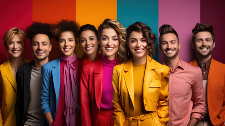 Portrait of group of smiling business people standing together over colorful background.