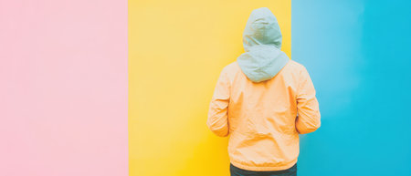 A person wearing an orange jacket with a hood stands before a wall split into pink yellow and blue sections during daylight.