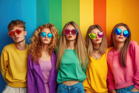 Five fashion models posing together wearing colorful sunglasses and clothes on a vibrant rainbow background