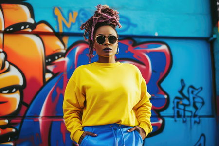 Vibrant androgynous urban style portrait featuring a non-binary individual with bold attitude and edgy fashion in front of a colorful graffiti wall. Embodying the trendy.