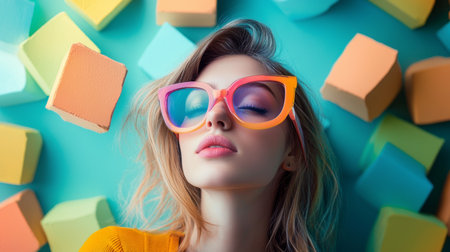 A stylish woman wearing colorful oversized sunglasses, surrounded by pastel-colored geometric blocks, creating a vibrant and trendy composition.