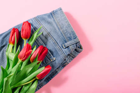 Jeans and bouquet of red tulips on pink background with copy space, empty text place. Advertising banner of fashionable casual comfortable clothes. Online shopping or goods delivery. Gift certificate.